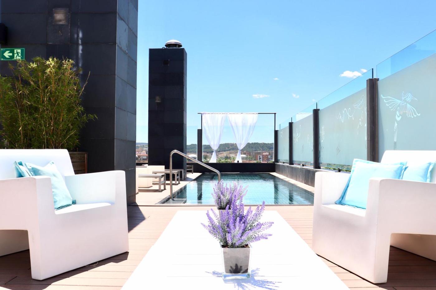 Este hotel de diseño se encuentra en el centro de Alcalá de Henares y está bien comunicado por carretera con Madrid. El hotel dispone de zona solárium, bañera de hidromasaje en la azotea con espectaculares vistas a la ciudad. Actualmente, está abierta. De 12:00 a 20:00 previa reserva. Máximo 12 personas al mismo tiempo.