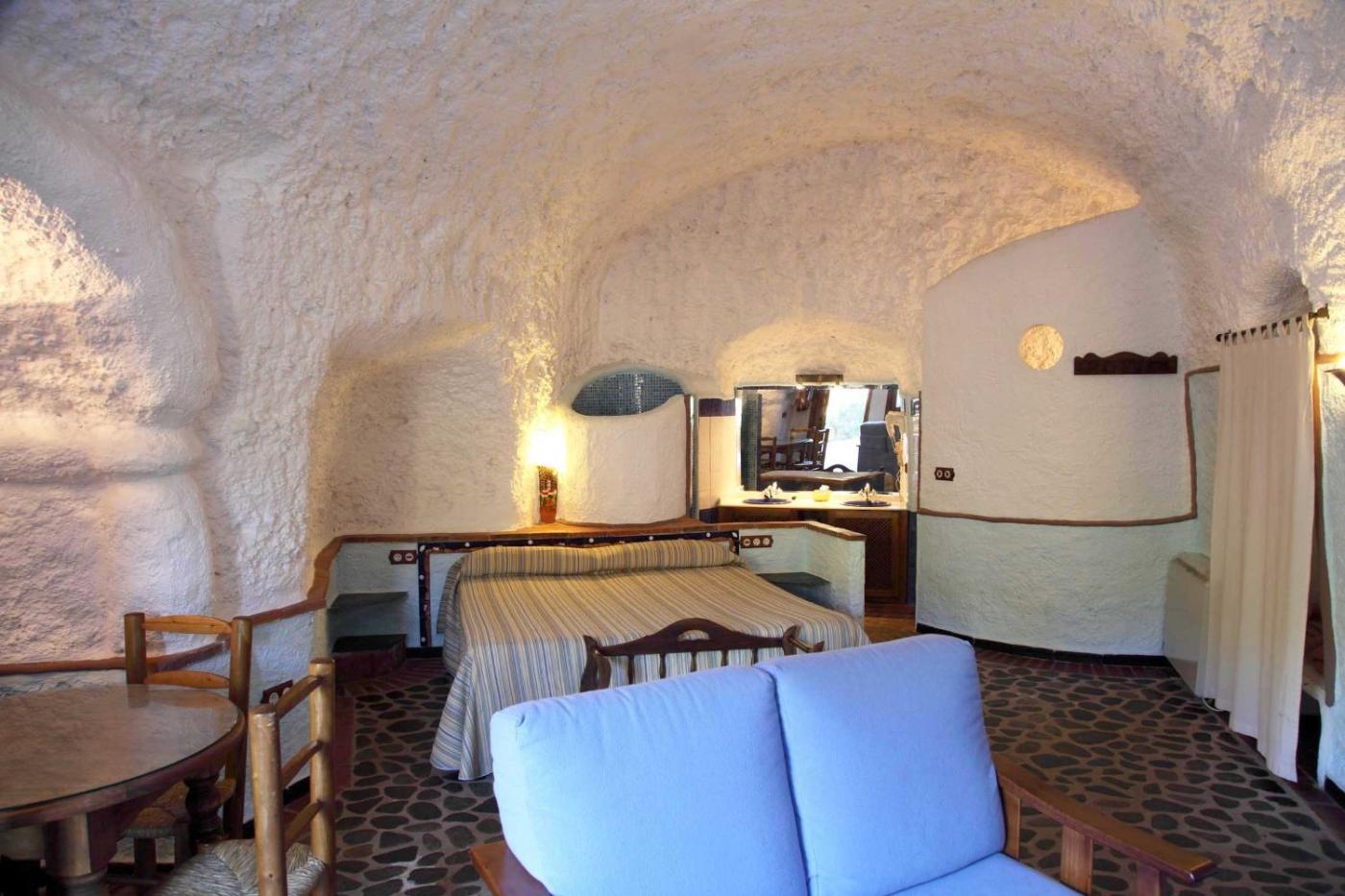 Cueva (4 adultos). Las cuevas de 2 dormitorios están totalmente equipadas y cuentan con 2 baños, cocina, comedor, calefacción y chimenea. ;