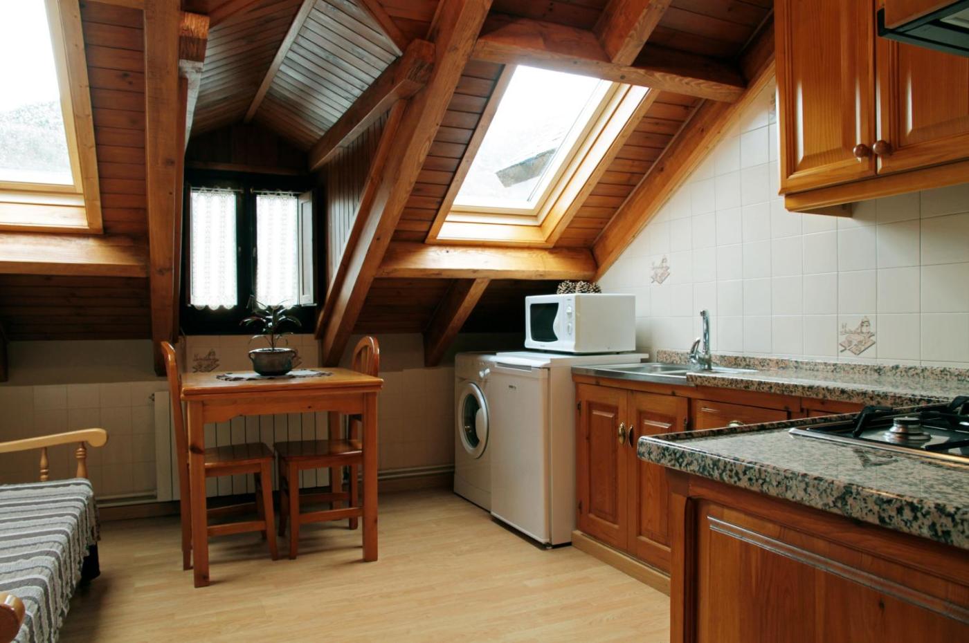Apartamento de 2 dormitorios. Este apartamento de estilo montañés está ubicado en la 2.ª planta y dispone de 1 dormitorio con cama doble, 1 dormitorio con 2 camas individuales y salón con sofá y TV de pantalla plana. Incluye WiFi gratuita, ropa de cama y toallas. Ofrece cocina o zona de cocina con fogones, horno, microondas y cafetera. En el exterior hay un jardÃn con mesas de picnic y barbacoa. Se ofrece aparcamiento gratuito.