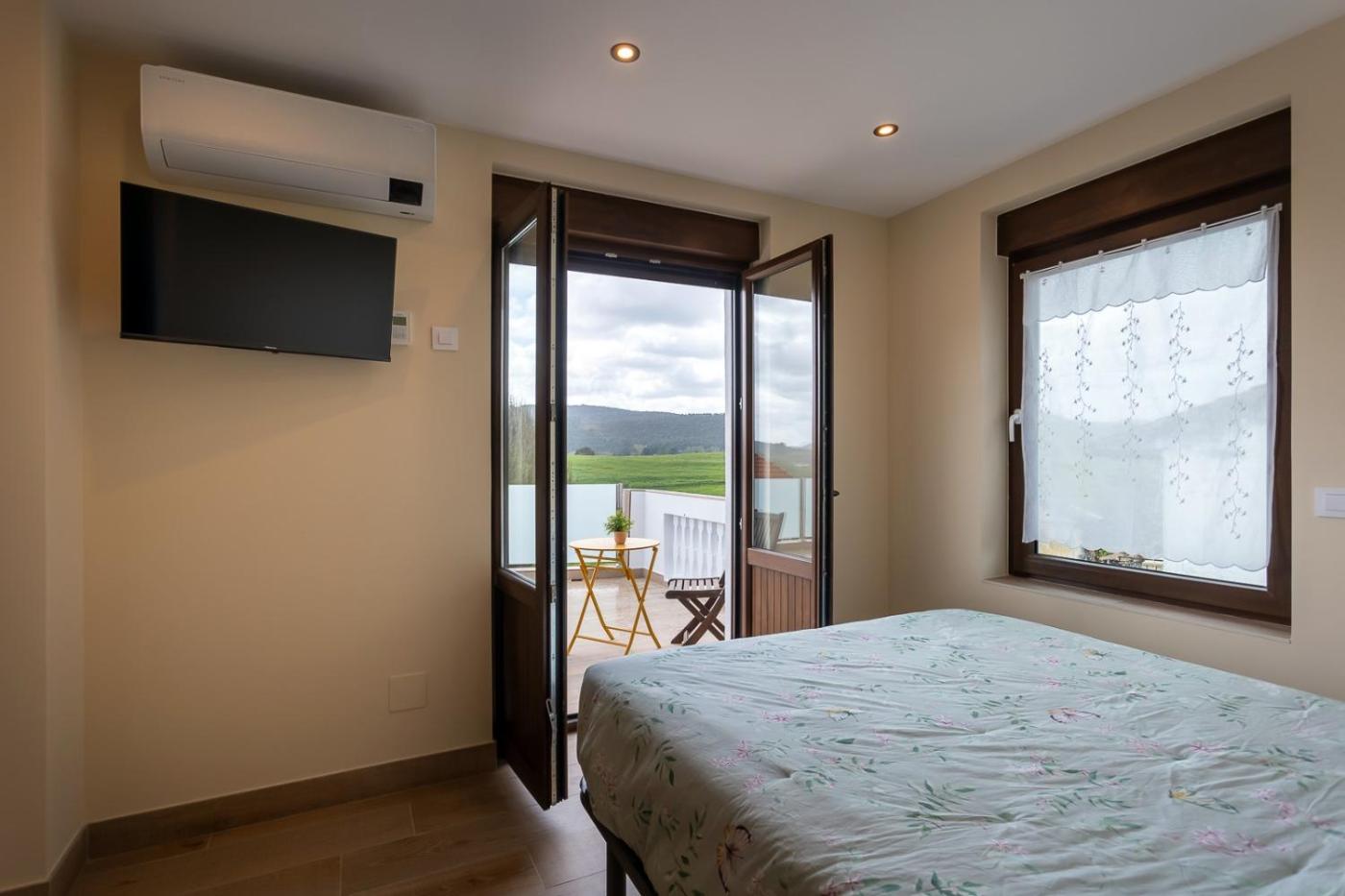 Habitación con cama grande y balcón. La habitación doble tiene aire acondicionado, armario, terraza con vistas a la montaña y baño privado con ducha. Tiene 1 cama.