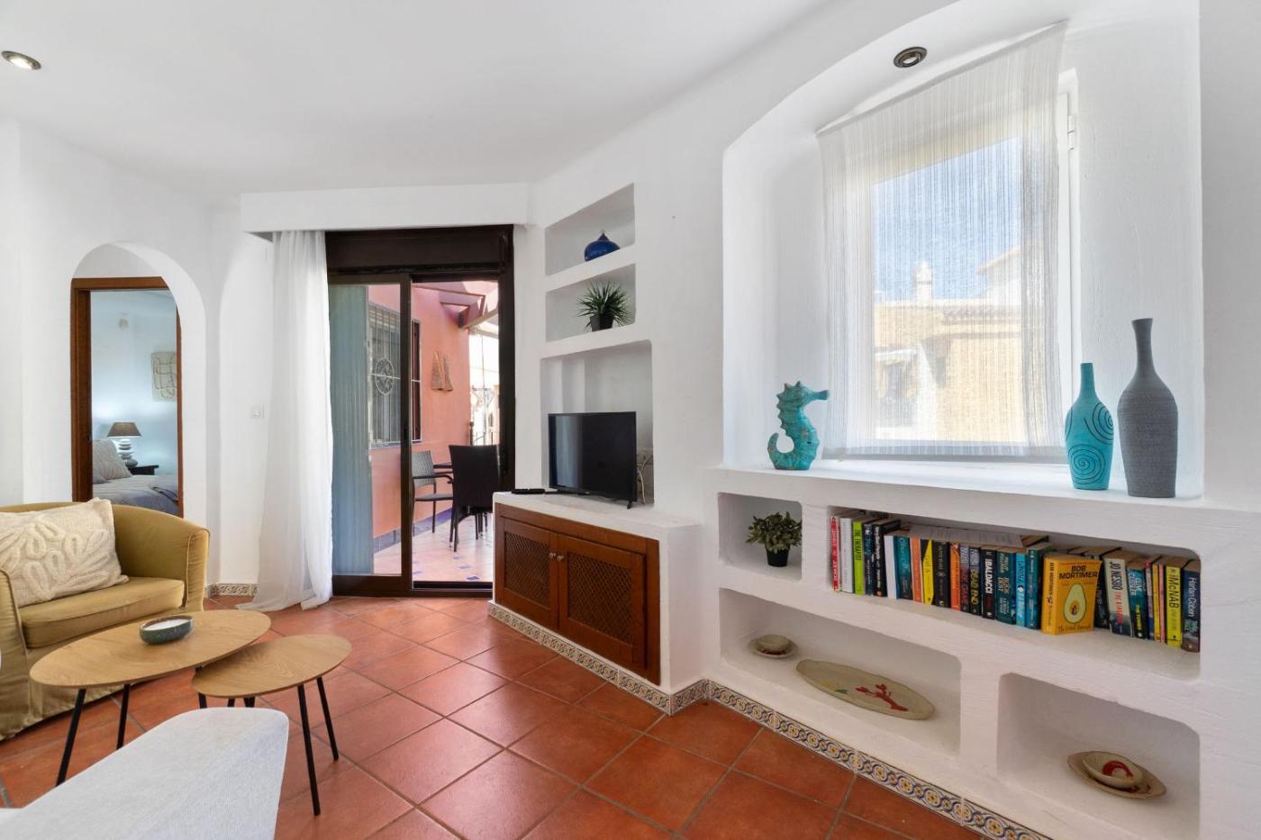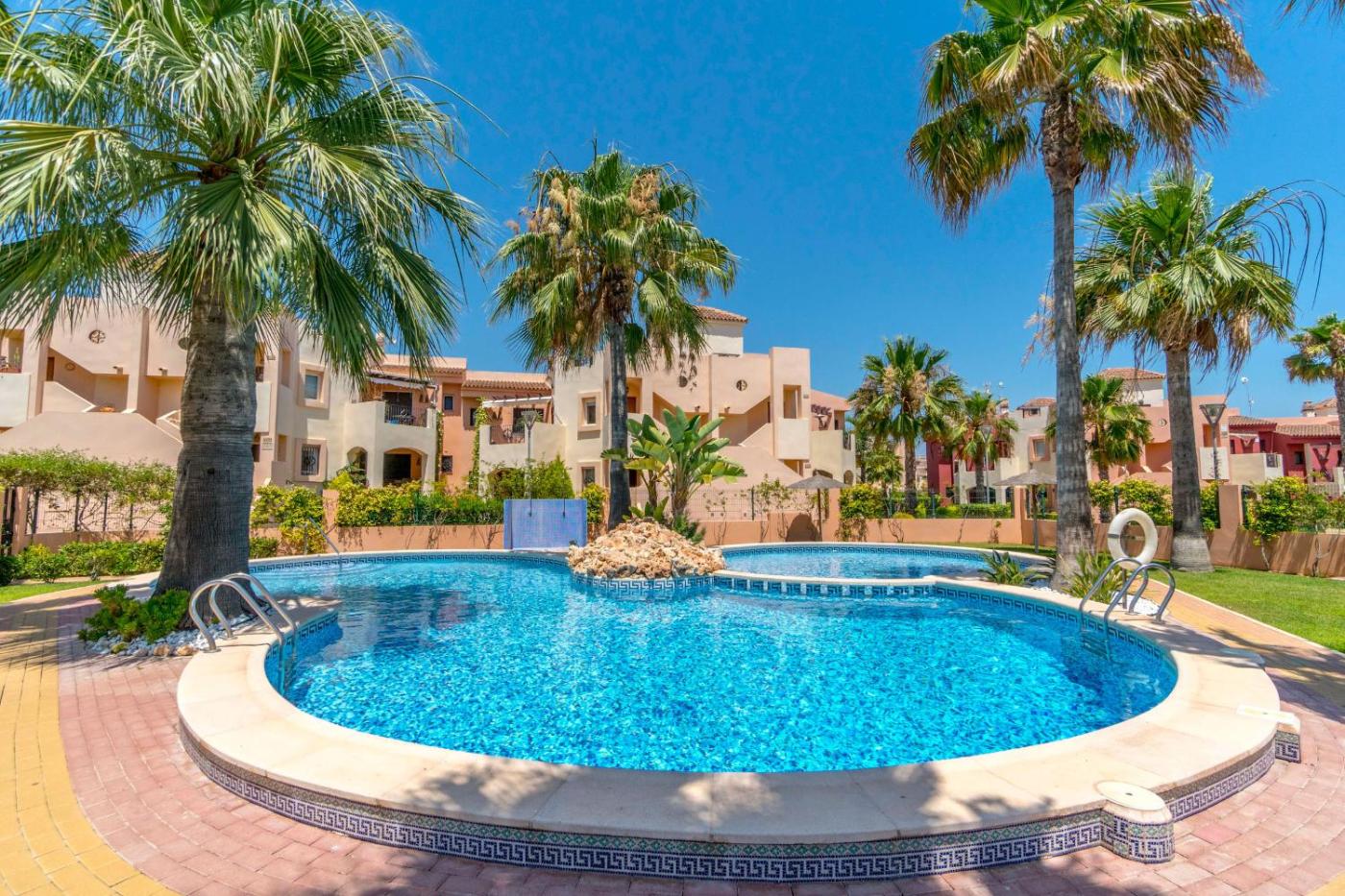 El apartamento cuenta con 2 dormitorios, 2 baños, ropa de cama, toallas, TV, cocina totalmente equipada y terraza con vistas a la piscina.