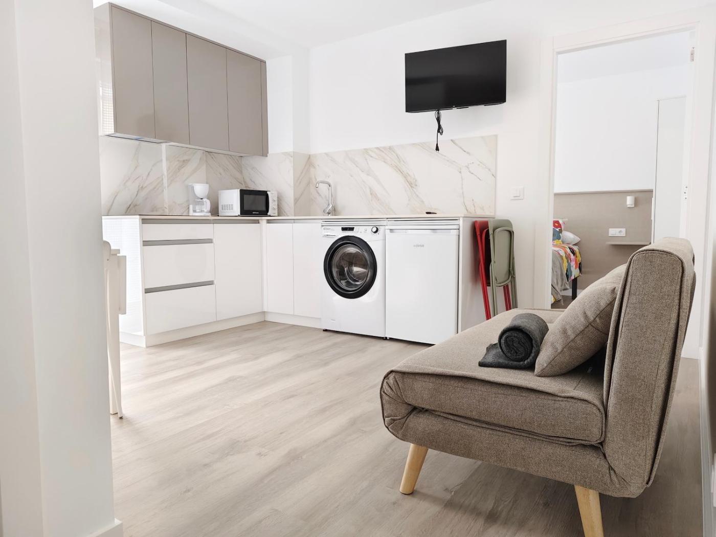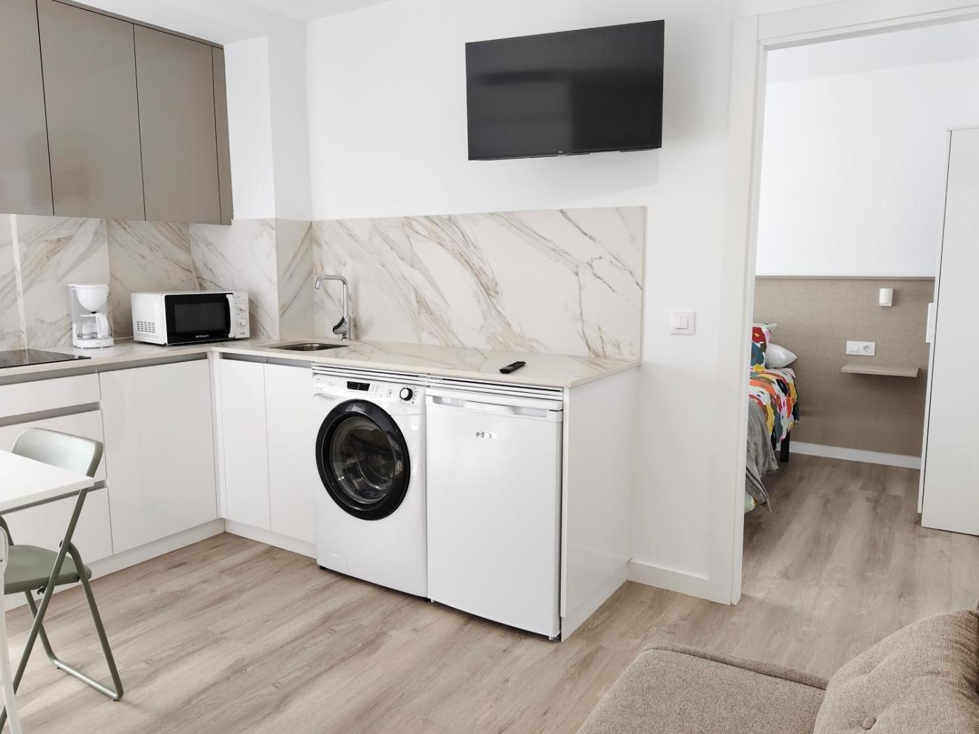 Apartamento Deluxe de 1 dormitorio. This apartment features 1 living room, 1 separate bedroom and 1 bathroom with a shower and a hairdryer. The well-equipped kitchen has a stovetop, a refrigerator, kitchenware and a microwave. Boasting an outdoor dining area, this apartment also features a washing machine, a coffee machine and a flat-screen TV with satellite channels. The unit has 3 beds.